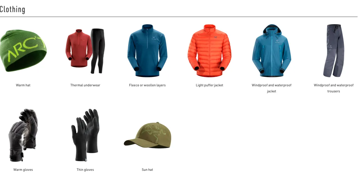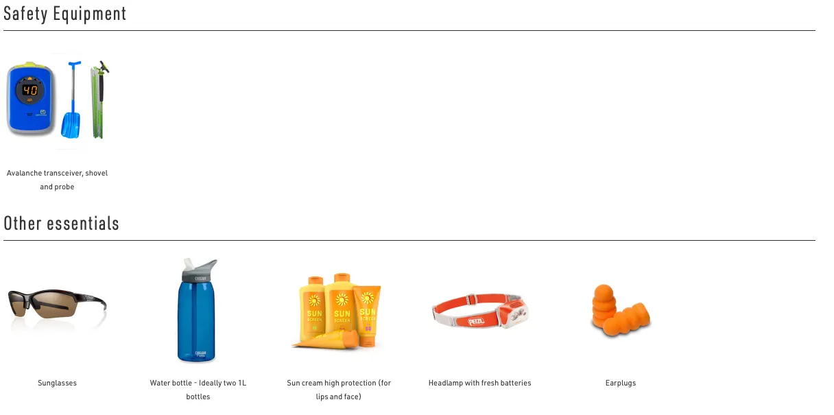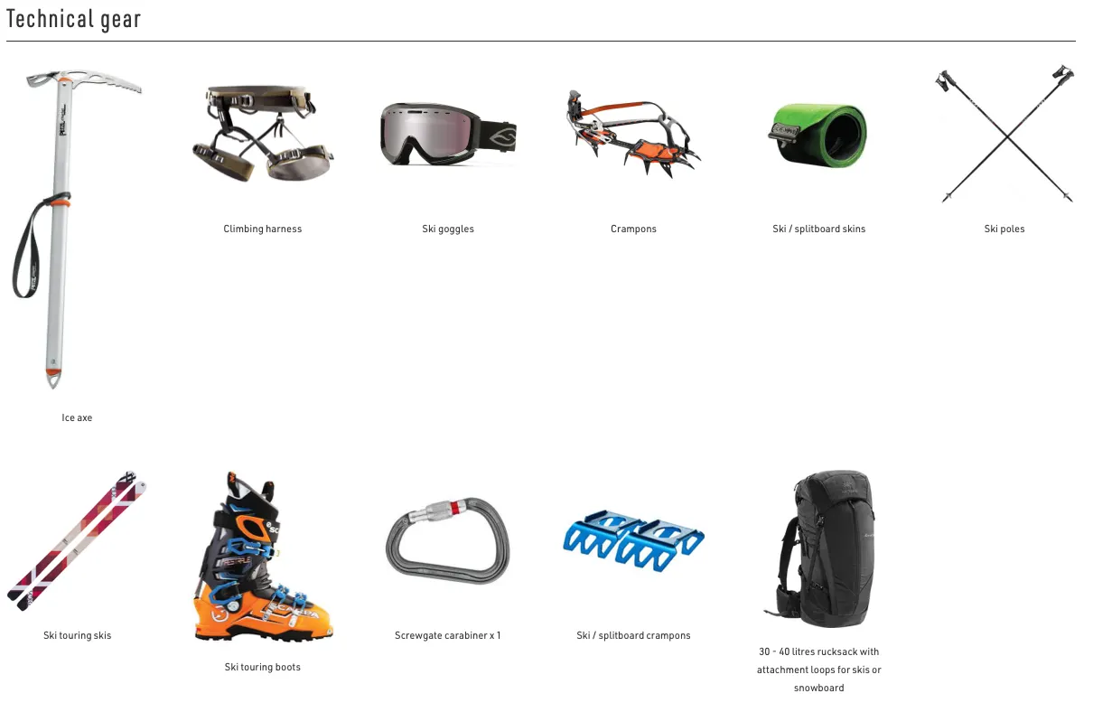 장비는 오뜨루트 스키투어에서 가장 신경써야 하는 부분입니다. 다양한 조건에서 잘 작동해야 합니다. 의류는 따뜻하고 가벼우며 빠르게 건조되며 움직임에 자유로워야 합니다. 여러 겹의 단열 소재 (하나의 두꺼운 소재 대신)에 의한 레이어링이 필요합니다. 폴리프로필렌, 울, 또는 유사한 합성 소재로 만든 속옷, 플리스 또는 기타 단열 소재의 층, 그리고 방수 쉘, 장갑과 모자도 착용합니다. 시간을 내어 장비를 신중하게 준비하고 필드에서 사용하여 익숙해져야 합니다.